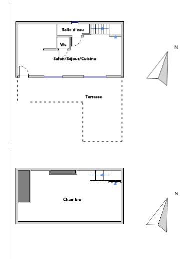 L'appartement de l'étage est un grand studio de 22 m2 avec comble aménagé et terrasse privative.